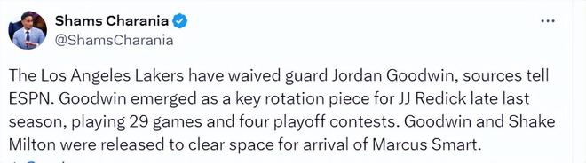 湖人隊最近執(zhí)行了古德溫230萬美元合同的球隊選項,但古德溫合同中僅有2.5萬美元是保障部分,但如果他在1月份仍留在湖人隊陣容中,這份合同將變?yōu)槿~保障。裁掉古德溫和米爾頓,讓湖人能夠用雙年特例(2年1100萬)的合同簽下斯馬特