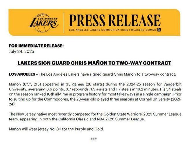 北京時間7月25日,湖人官方宣布,用一份雙向合同簽約落選秀克里斯-馬農(nóng),引進又一位后衛(wèi)球員,遭輿論調(diào)侃“湖人縫縫補補又三年”。至于今夏代表湖人出戰(zhàn)夏季聯(lián)賽表現(xiàn)出色的貝茲利,他倒數(shù)第二場夏季聯(lián)賽受傷,還能否沖擊一份合同成為懸念。