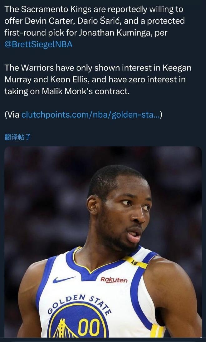 值得一提的是,根據此前Clutch Points記者Brett Siegel報道,國王愿意向勇士的報價為:卡特+薩里奇+1個受保護首輪,但勇士顯然對于如此報價不滿意。