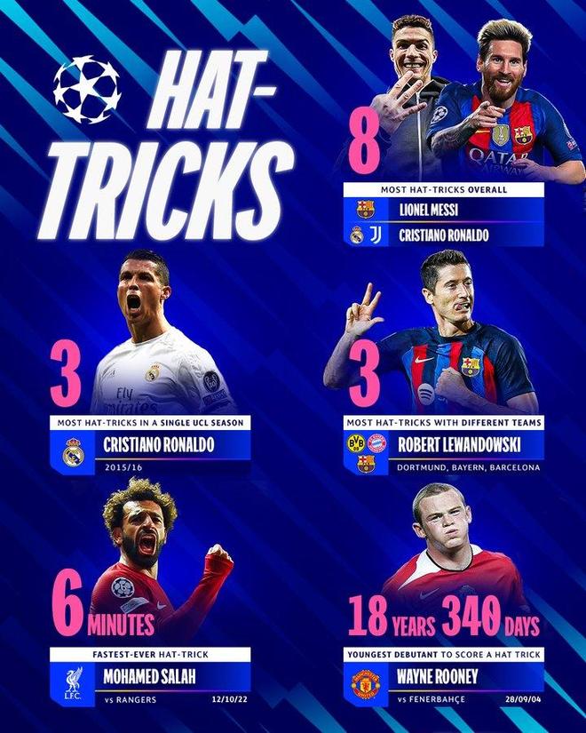 直播吧07月11日訊 歐冠官方發布了歐冠歷史上球員上演帽子戲法的各項紀錄。